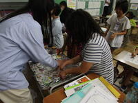 4年生の社会科「ごみのしょりと利用」で、市民の方が講師となって講座を行ってくださいました。子供たちは一生懸命メモを取りながら聞いていました。身近なごみが何に分別されるかを考えたり、「3R」(リデュース、リユース、リサイクル)について知ったり、たくさんの事を学びました。ペットボトルが、ワイシャツやネクタイに生まれ変わることを聞き、驚いていました。最後に、ブロック状にプレスされた空き缶に触れたり、空き缶で作った缶ぽっくりや牛乳パックやストローで作った竹トンボなどで遊んだりしました。
