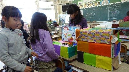 前の時間までに作っていた工作が仕上がりましたので、今日はお友だちの作品をみて、くふうされているところやじょうずにできているところなどを伝える時間です。