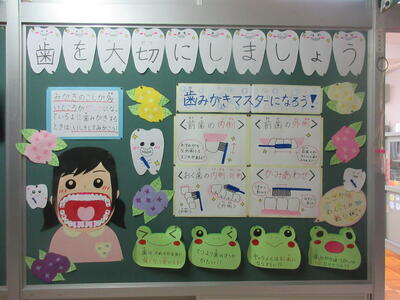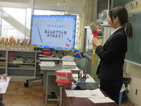 養護教諭の実習生が2年生に向け、歯磨きの大切さと正しい歯ブラシの使い方を教えてくれました。大きな歯ブラシを作ったり、ICT機器を活用したりして、分かりやすく丁寧に指導してくれました。2年生は、永久歯が生えてくるこれからの歯磨きが大切ということに気が付いていました。