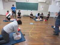 今日は春日部市消防本部から1名の講師をお招きし、万が一に備えて心肺蘇生・AED講習会を実施しました。ダミーの人形を相手に、実際に正しい胸骨圧迫の仕方を学びました。その後、AEDの訓練機を用いて使い方を学びました。最後に、実際の場面を想定して、役割を決め、繰り返し練習をしました。
