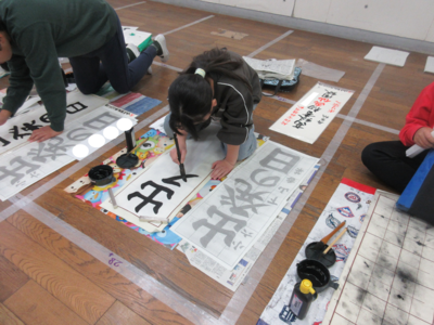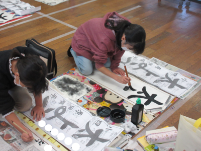 先週から「書きぞめ」の練習が始まりました。1,2年生はペン字、3年生以上は毛筆です。日頃書写の時間は机上に半紙や硯、見本を置いて書きますが、「書きぞめ」は多目的室で行っています。お手本を見ながら大きく伸びやかな作品ができるよう練習中です。