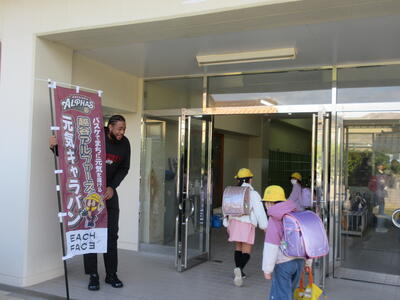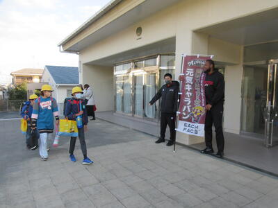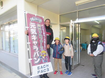 27日(木)プロバスケットボールチーム「越谷アルファーズ」からジャレル・マーティン選手が来校し、登校する子供たちを笑顔のあいさつで迎えてくださいました。子どもたちは、ジャレル選手の背の高さにびっくり。うれしそう、はずかしそうにあいさつをする子、一度昇降口に入ってからまた戻ってきて元気にあいさつをする子。持久走大会前にジャレル選手から元気と勇気をいただきました。