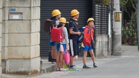 通学班の集合場所でメンバーがそろうのを待っている子どもたち。