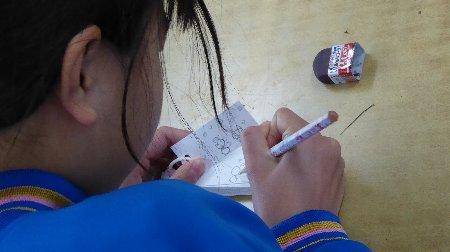 いつもの大きな紙ではなく、単語カードみたいなカードにかいています