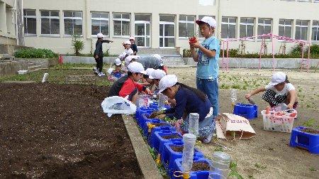 2年生が登校するときから楽しみにしていたミニトマトの苗うえ。