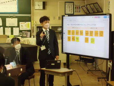 参観する職員は、教室後方に設置したJamboardに付箋で意見を記載していきます。これを用いて研究協議を効率よく進めています。