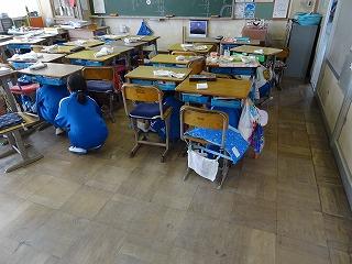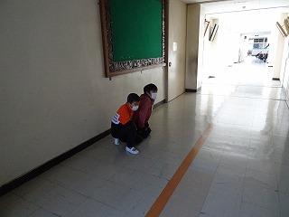 昼休みの時間に抜き打ちの避難訓練を行いました。子供たちは場所ごとに考えて一時避難をしていました。