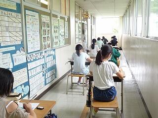 空間の有効活用(家庭科では対面での学習を避けるため、廊下も活用しています。教師の話を聞く際は、廊下の児童が家庭科室に入って一緒にききます。)