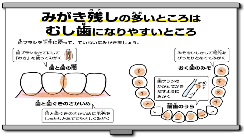 歯科健診の結果、上沖小学校では、「歯垢」がついている人が多くいました。この「歯垢」について、そして正しい歯みがきについてを全校に伝えました。