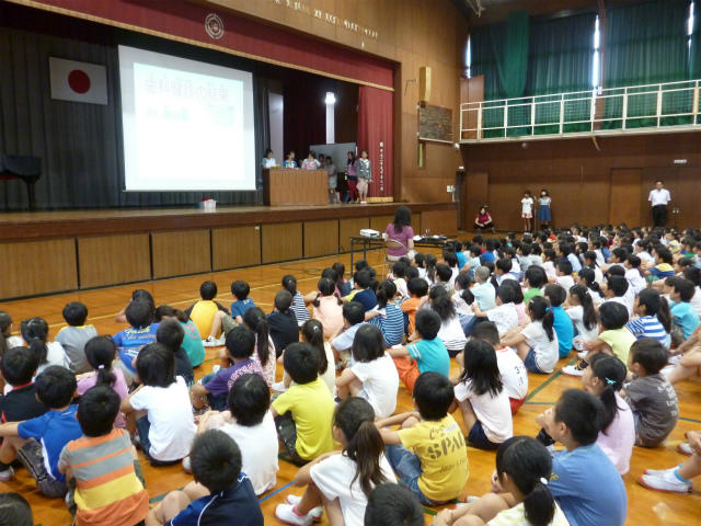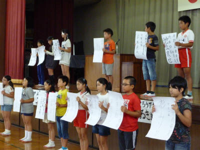 明日の市内陸上大会に向け、全校で選手になった児童に向け、激励会を行いました。インタビューや校長先生の言葉、選手代表の言葉など、激励会が充実したものになりました。