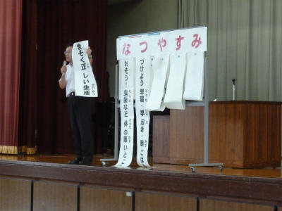 今朝、児童集会を行いました。今日は整備委員会からのお知らせでした。掃除の仕方や清掃用具の使い方について、分かりやすく説明してくれました。