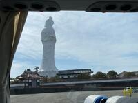 大迫力の磐梯山!「きれー!」「前見て!景気がきれいだよ!」少し赤く色づいてます。会津慈母大観音像にも「すげー!」