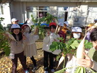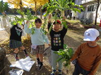 今日も2年生です!5時間目に育てていた大根を収穫しました。「大きい!」「どんな風に食べるのかな?」季節柄、お鍋やおでんかな?