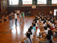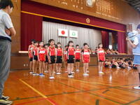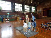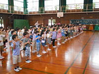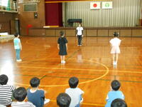 朝は1・6年生の運動タイム。1年生は6年生の立派な姿を見て、行い方を勉強します。1年生ですが、真っ直ぐ並んだり、腰骨を立てて姿勢よく話を聞くことができました。