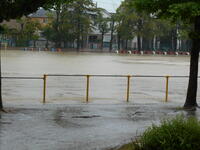 金曜日は豪雨でしたが、安全に過ごすことはできましたでしょうか。子ども達の安全な下校にご協力いただきありがとうございましが。陸上大会で整備した校庭はご覧の通り、土曜日は湖のようになり跡形もなくなってしまいましたが、徐々に水が引け今日は校庭で運動ができるくらいまでに回復しました。