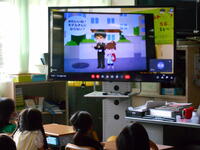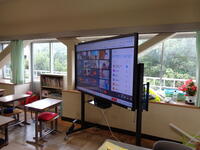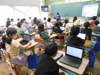 2年生の教室では、タブレットを使って学習を進めていました。子ども達が記入した、学習して思ったことが一覧になってモニターに映っています。2年生でもスムーズに操作していることに驚きました。ICTでしかできない学習にもたくさん取り組んでいます。