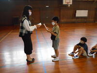 6年生が1年生の新体力テストをお手伝い。目線を合わせて話してあげています。1年生のみなさんも、こんな素敵なお兄さん、お姉さんになってくださいね!