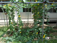 砂場となったピアノ池はお披露目の日をじっと待っています。元気に咲くひまわりもありますが、夏野菜は収穫を終えつつあります。