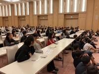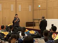 はじめに寄木細工につい説明をしていただいています。作品など、見せていただくごとに「おーっ!」「えーっ!」と歓声があがります!