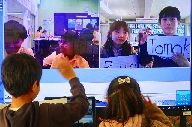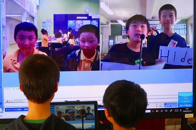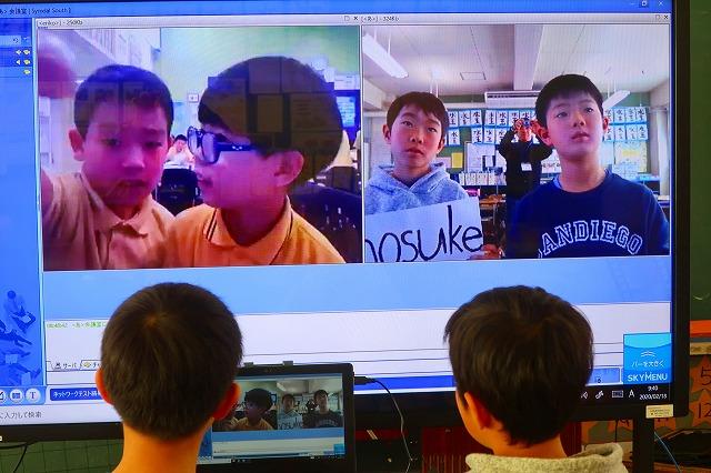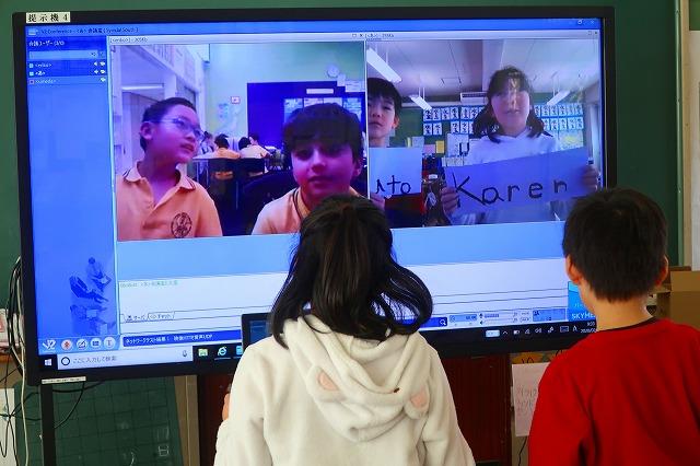 3年生がオーストラリアのメルボルンの小学生と、インターネットを通じて交流学習をしました。自分の名前をローマ字で書いたカードを持ち、自己紹介や好きなものは何か聞くなど交流をしました。自分たちの英語が通じて、子供たちも大きな自信になりました。オーストラリアの小学生の日本語も上手でした。