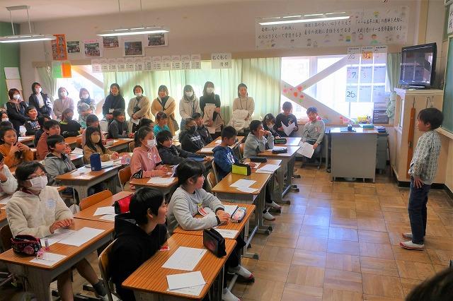 学級活動では宿題や冬休みの生活について確認したり、学級園の野菜を分け合ったりするなど、子どもたちは、楽しそうに笑顔いっぱいの様子でした。