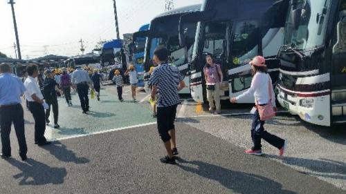 バスで気持ち悪くなった人が少しいますが、みんな元気です。この先も安全運転で。進みます。