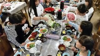 初日の夕食はスキヤキです。いっぱい食べて、今日の疲れを吹き飛ばします。