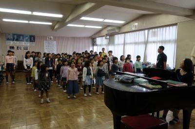 高学年と低学年のクラスが音楽室に集まり、「校歌交流会」を開催しています!