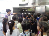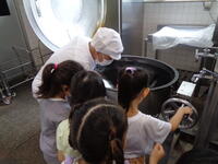 今日は1年生が給食室たんけんを行いました。毎日1000食近くの給食を作っている給食室なので、釜やボウル、しゃもじなど1つ1つの道具の大きさに1年生もびっくり!また、調理員さんの説明を受けながら器具を触らせてもらっています。熱心に話を聞き、どんどん質問する素敵な1年生でした!