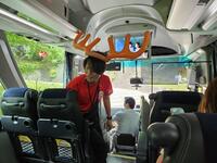工夫されたバスレクに大盛り上がりです!クラスの様子がよく表れてます!充実した二日間になりそうですね!朝早かったので、目を瞑ってお休みしている子も。