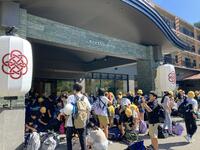 子どもたちの元気なあいさつが学校に響きます。いよいよ林間学校スタートです!