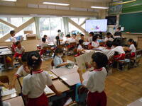 2年生の教室では、タブレットを使って学習を進めていました。子ども達が記入した、学習して思ったことが一覧になってモニターに映っています。2年生でもスムーズに操作していることに驚きました。ICTでしかできない学習にもたくさん取り組んでいます。