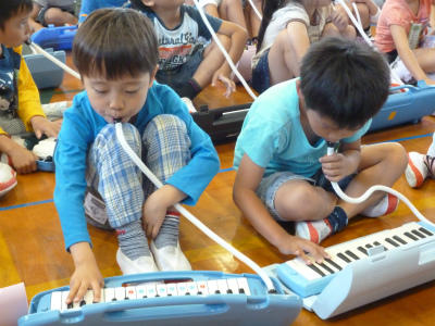 3時間目には、1年生を対象とした「鍵盤ハーモニカ講習会」を行いました。ケースの置き方・準備の仕方から音の出し方まで、講師の方からわかりやすくお話をいただきました。