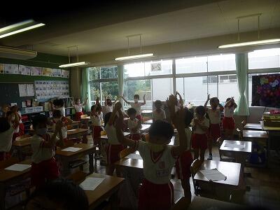 運動会の表現の練習を、教室で練習中です。緊急事態宣言発令中なので、自分のクラスで振り付けを覚えて踊る練習を行いました。