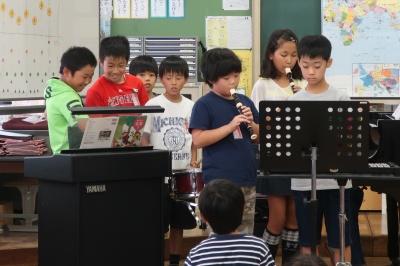 おさらい会! 投稿日時 : 2019/07/11 上沖小 カテゴリ: 音楽での1学期のおさらい授業です。5年5組が、校長先生を招待しました。歌や演奏を一生懸命、披露してくれました。1学期の間にクラスがしっかりまとまり、素敵なおさらい会でした。