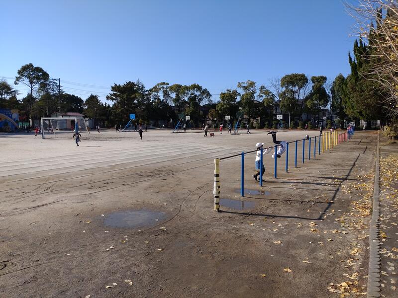 業間は、密に気をつけながらたくさんの児童が外遊びをしていました。担任の先生とドッチボールをする姿も見られます。