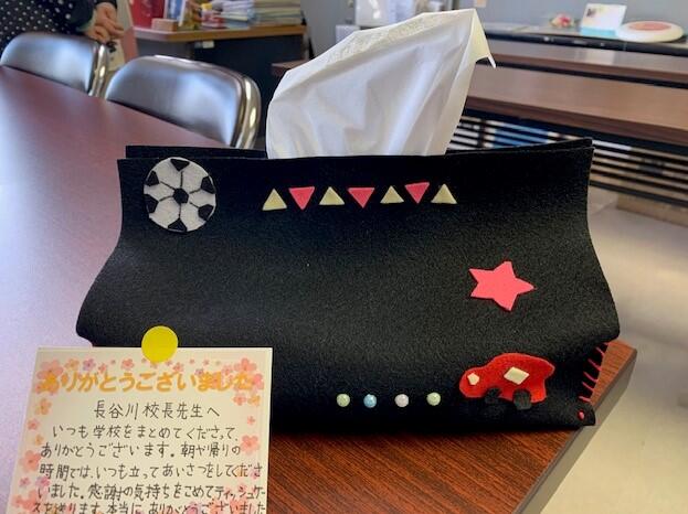 6年生が、ありがとう活動を行いました。今回紹介するのは、お世話になった先生方への心のこもったプレゼントづくりです。それぞれの先生方に、好みの色やデザインを聞きに来てくれ、子どもたちがイメージを膨らませ、作成してくれました。子どもたちが作ってくれたのは、ティッシュケースでした。添えてくれたメッセージもとても嬉しかったです。いつまでも、大切に使わせていただきます。ありがとうございました。
