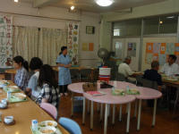 今回は、親子で「杏仁豆腐とカスタードクリーム」を作りました。計量カップで水や牛乳を量ったり、包丁でフルーツを切ったり、各班ごとに親子で協力して調理しました。初め卵を割った子、いつものお手伝いを生かして手際よく道具を洗う子・・・・・とても楽しそうでしお皿に彩りよく盛り付け完成!!どの班も100点満点の出来栄えでした。最後は、みんなでおいしくいただきました。