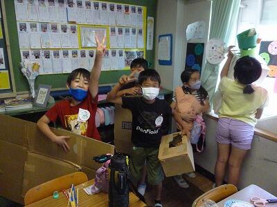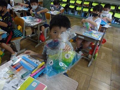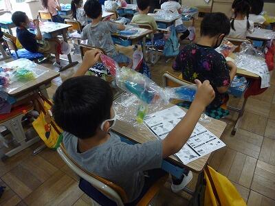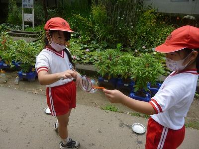 1年生は、自分で作った、シャボン玉作成機を使って、きれいなシャボン玉を作ることができました。