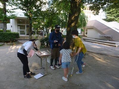 じゃんけんげーむで負けたら新聞紙を半分にしていくゲームの様子です。