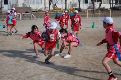 3年生の体育。タグラグビー。帝京大学の先生と一緒に研究を進めています。今日は、先生が授業を手伝ってくださいました。