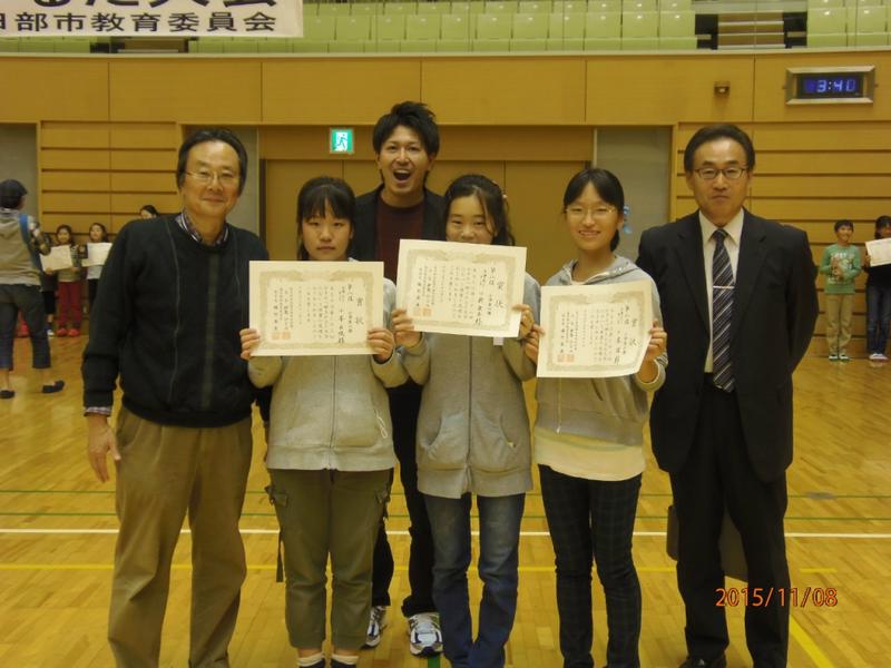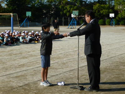 全校朝会の終わりに、先日行われた市内音楽会に出場した5年4組に賞状