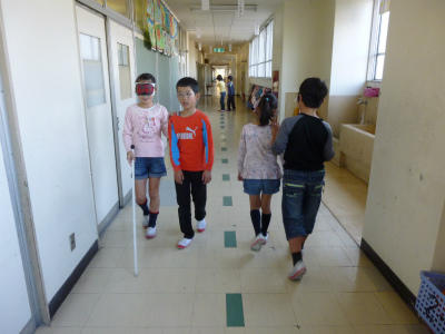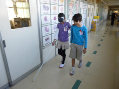 今日、4年生の総合的な学習の時間の一環として、アイマスク・白杖体験