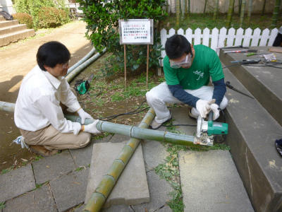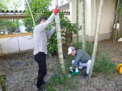 に向け、竹とんぼの材料となる竹を切る作業を行いました。休みの日にもかかわ