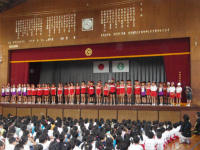 今朝の児童集会では、大会に出場する代表選手たちに、全校でエールを送る「激励会」が行われました。