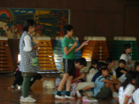 6月の児童集会は全体レクです。企画委員の児童がペア学年対抗「〇〇を運べ」ゲームを企画してくれました。大きなビニルの袋に新聞紙を詰め「〇〇」棒を作りました。上沖鉛筆、上沖味うまか棒、上沖味ガリガリ君を大玉送りの要領で、ペア学年が力を合わせて頭の上を送っていきます。