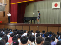 全校朝会では、本校教諭の「リフティング100回」の実演の後、校長先生より、ルールを守ることの大切さについてのお話がありました。
