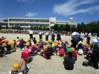 業前は、校庭で初めての全校練習。開会式の整列の仕方、退場の仕方など、短い時間でしたが緊張感をもって取り組んでいました。