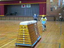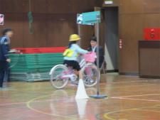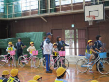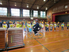 学科試験(10分)は昨日までに各学級で行い、今日は、体育館での実技試験です。後方確認からのスタート、2段階での交差点の通行の仕方、障害物をよける際の安全確認・・・・・児童一人一人が、交通指導員さんの支援のもと試験を行いました。全員が免許証をいただきました。早速、今日から実践していきましょう。