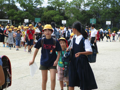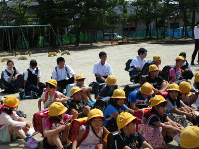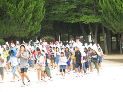 本校では、毎年この日に避難訓練を実施しています。久しぶりの学校でしたが、子供たちは「おかしもち」を守り、真剣に訓練を行うことができました。